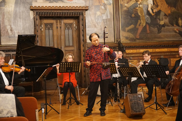 音乐会上,埃尔福特市副市长科诺博利希博士(Dr. Knoblich),埃尔褔特应用科技大学孔院德方院长瓦格纳教授分别致辞,向大家致以新年祝福。演出以中国传统名曲《喜洋洋》开场,把观众们带入喜气欢快的节日气氛中。中国传统曲目《在水一方》《茉莉花》《万马奔腾》《月光下的凤尾竹》《渔舟唱晚》等与西方曲目《西班牙进行曲》《巴赫D大调协奏曲》《欢迎/卡巴莱》《巴尔干》穿插,杜建国先生二胡演奏与莱比锡新沙龙乐团的管弦乐器配合默契,相得益彰,完美演绎出中外名曲的新内涵。整场音乐会曲声悠扬,悦耳动听,观众们如痴如醉,音乐会持续了两个小时,每一首曲子演奏完毕,全场观众都报以热烈的掌声,对演员们精湛的演奏给与肯定;观众们也积极互动,不时合着节拍鼓掌配合,现场气氛热烈欢快。新年音乐会的最后一首曲目——《万马奔腾》将整场演出推向高潮。演奏结束,乐队指挥带领乐队向全场观众齐声送上新年快乐的祝福。观众们雷鸣般的掌声经久不息,久久不愿离去。(埃尔福特孔院 周艳文 贾峰昌 孟冬