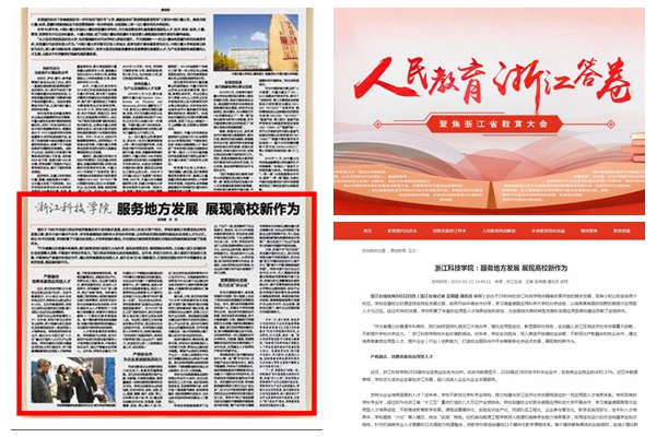 全省教育大会召开在即,《浙江日报》、浙江在线等媒体梳理浙江高校发展样本,展现浙江教育改革发展的重大成就,以《服务地方发展 展现高校新作为》为题,聚焦我校产教融合,培养高素质应用型人才;产学研合作,为企业发展提供原动力;发挥国际化优势 搭建桥梁助力企业“走出去”
