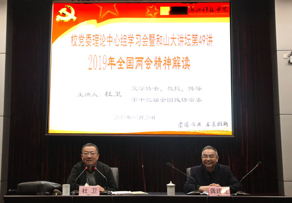 3月28日下午,学校举行党委理论学习中心组学习会暨和山大讲堂第49讲,传达学习2019全国两会精神。我校原校长、第十三届全国政协常委杜卫作宣讲报告。校党委书记龚建立主持会议,校党委理论中心组成员出席。