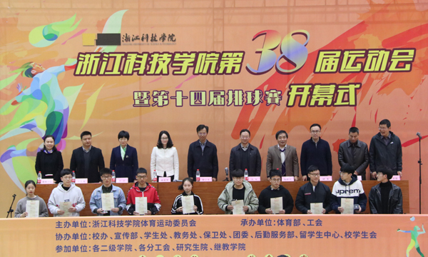411日下午,校第三十八届运动会开幕式小和山校区体育馆举行。校党委副书记符宁平、副校长冯军、纪委书记陆爱华等出席开幕式并为受表彰的2018年度校“群众体育先进单位”和“学生十佳运动员”代表颁奖。校体育运动委员会全体成员、2018年度受表彰单位和个人代表、各参赛代表队运动员代表参加开幕式。