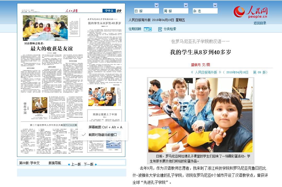 419日出版的人民日报海外版刊登《在罗马尼亚孔子学院教汉语——我的学生从8岁到40多岁》一文,这是我校罗马尼亚克鲁日孔院教师志愿者盛新月(上图二中)根据自己从事孔院志愿者工作的经历所写的。盛新月是我校16级汉语国际教育专业硕士,2017年7通过国家汉办选拔赴印尼八华学校(印尼最大的三语国际学校)担任志愿者,去年9月前往克鲁日孔子学院任汉语教师。