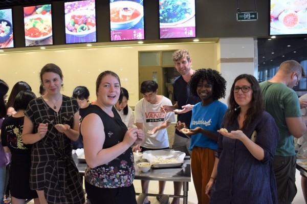 夏令营活动中,德国教授为中德两国学生讲授专业课程,指导“2+3”项目学生与德国学生一起完成课程项目。外国语学院/中德学院为德国学生开设中文日常会话交流和中国文化介绍为主在中国文化。此外,学院还组织参观茶叶博物馆、学习太极拳以及茶馆体验文化体验活动。在夏令营活动结束前,学生参加饮食文化交流为主题的包饺子活动。在闭幕式上两国学生共同展示了为期两周的课堂学习成果。为期两周的活动“2+3项目学生不仅学习了专业知识,也提前了解和体验德国的课程学习方式,为即将开始德国学习生活打下基础。德国师生体验中国传统文化,亲身解中国文化的博大精深 (外国语学院/中德学院 路璐/文 学生 钟芳怡/摄)