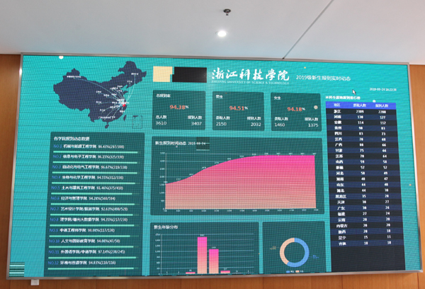 据悉,2019年学校共录取本科新生3600余人,今年学校首次采用智能化报到系统,通过大数据可视化平台,将新生报到的实时数据反馈到电子屏幕上,报到人数、男女生报到率、各省报到人数比,以及各院系人数报到率等,内容不断更新,为校园管理提供实时准确数据。(新闻中心 尹媛/文  安吉校区学生事务中心 贾晓龙 学生记者 郑毅豪 郑忻宇 赵佳辰 郑叶萌 王程/摄 )