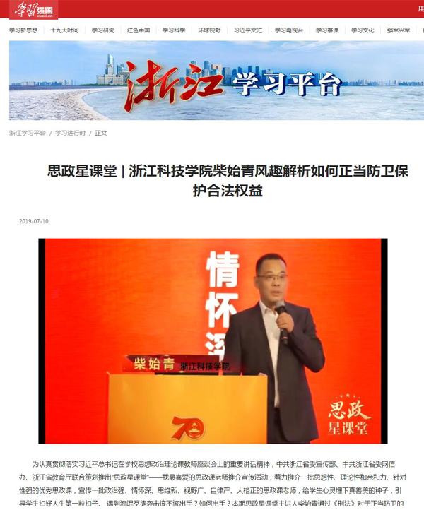 7月10日,我校马克思主义学院柴始青主讲的《解析如何正当防卫保护合法权益》(点击观看)入选学习强国平台的浙江学习平台-学习进行时版块。