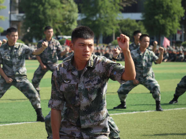 阅兵式上,3600余名2019级新生,集聚绿茵新田,排列整齐方阵,昂首挺胸,军姿挺拔,擒敌拳表演,口号嘹亮、动作整齐,向大家展示军训成果。阅兵式上还举行2019年新兵欢送仪式和退伍军人返校仪式。(学生记者 徐烂\文 学生记者 王依莎 产文强 /摄)