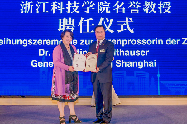 欧珍在致辞中表示,浙江科技学院与德国高校、科研机构合作历史悠久,成果丰硕。浙江省和德国下萨克森州、石荷州之间良好的伙伴关系为两国高校间的合作提供了良好氛围。中德论坛为两国科学、教育、经济和政府间交流提供了非常宝贵的平台。她说,今天不论德国还是中国,对于专业人才的巨大需求使得应用型人才培养越来越重要,相信此次论坛必将使中德两国高校产教融合提升到一个新的高度。校长赵东福向欧珍颁发聘书,聘请她为学校名誉教授。