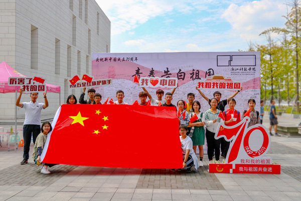 9月起,校园里一派欢庆的气氛,主干道红艳艳的道旗,分别写有“热烈庆祝中华人民共和国成立70周年”“不忘初心 牢记使命”等大红字样,让师生感受到浓浓的喜庆氛围。小和山校区银杏广场上竖起了半人高的小雕塑,分别有庆祝中华人民共和国成立70周年标志和“I ❤ZUST”字样,路过的师生,纷纷停下脚步与它们合影留念。