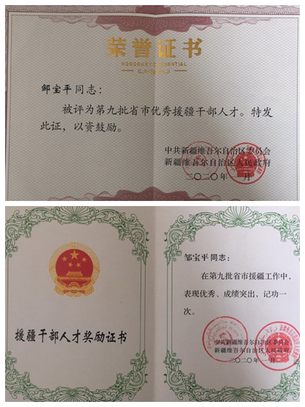 邹宝平同志在疆期间,把阿克苏当作自己的第二故乡,珍惜机遇,不忘初心,努力践行“舍家报国,倾情援疆”的崇高使命,把岗位当阵地守,把援疆当事业干,把奉献当本分看,努力践行援疆承诺,积极投身新疆大学科学技术学院阿克苏校区的教学、科研、传帮带、转设新疆理工学院等各项工作。先后获得“优秀援疆人才”“浙江优秀援疆教师”、援疆信息宣传工作先进个人、“四比四创”活动先进个人、新疆大学科学技术学院阿克苏校区“优秀共产党员”等荣誉。