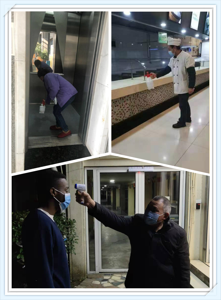 各留学生公寓楼门卫、清卫配备口罩,要求上班期间全程佩戴,并在各楼宇配备最新版额温枪,及时测量学生体温;