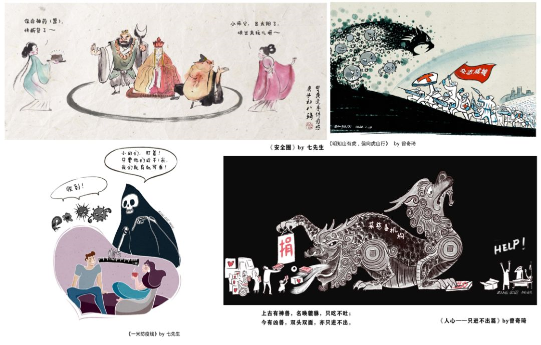 “漫画这种艺术有其特殊的特性和价值,能够以老百姓喜闻乐见的形式对社会事件表达艺术家观点。接地气、易传播,而且创作周期相对较短。因此,在这个疫情严重的特定大环境下,我采用漫画这种形式,希望能用自己的专业技能为抗疫出一份力。” 曾老师说:“艺术也需要关注社会,套用习总书记的话是,我们要把画画在大地上。”