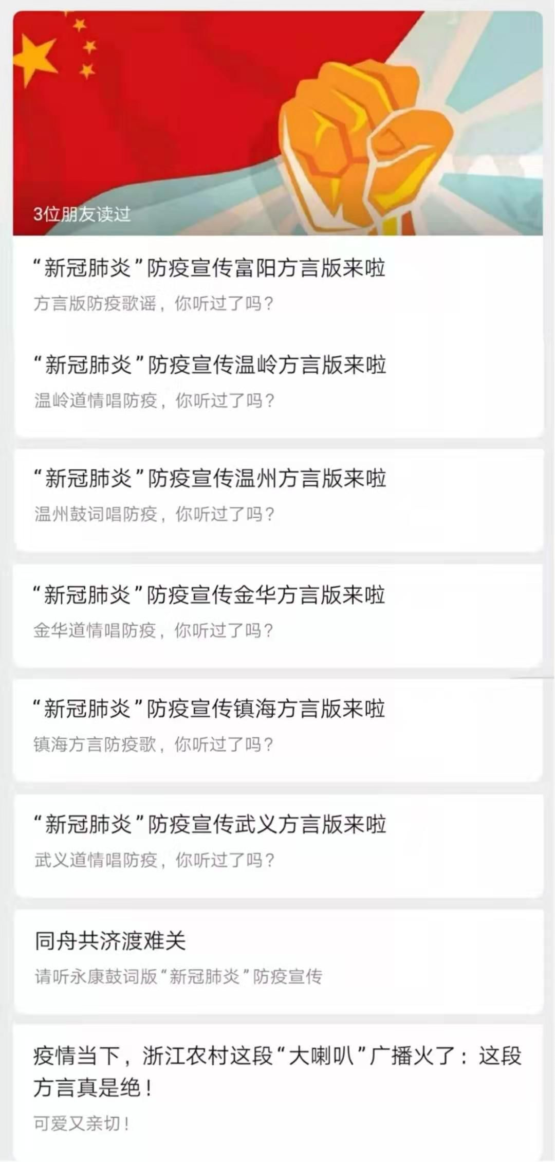 富阳方言歌谣、永康鼓词版、金华道情版……这么多的方言版宣传视频你“一网打尽”过吗?为防控疫情,我省各市县老百姓以大家喜闻乐见的形式,创作出了一批方言版的视频宣传作品。人文与国际教育学院通过其负责运营的浙江省语言资源保护宣传平台“浙江乡音”微信公众号,借助浙江省语保专家团队收集推荐的我省各市县方言版视频防疫宣传素材,1月28日起每天一期推出系列推文,与大家分享防疫知识,传递弘扬同舟共济,众志成城的正能量。至今已推送村头“大喇叭”2期,温岭、镇海、武义等方言版共10期,引发社会公众和省内外语保专家广泛关注和好评。