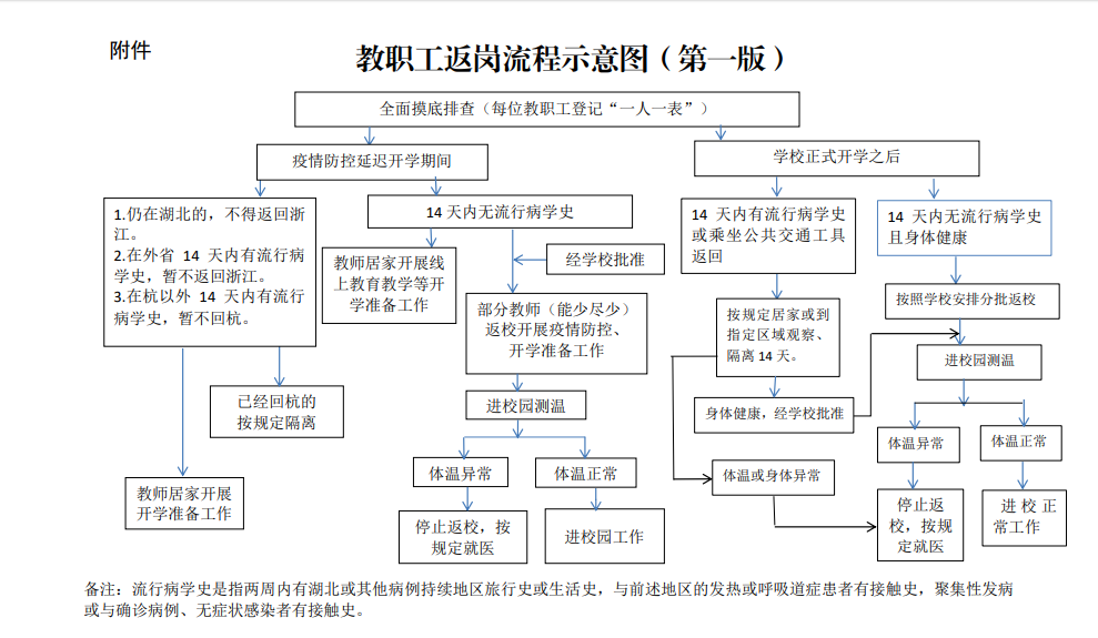 教职工返岗,严格按照浙江省教育厅新型冠状病毒感染的肺炎防控工作领导小组办公室《关于做好疫情防控期间教师返岗工作的通》执行。