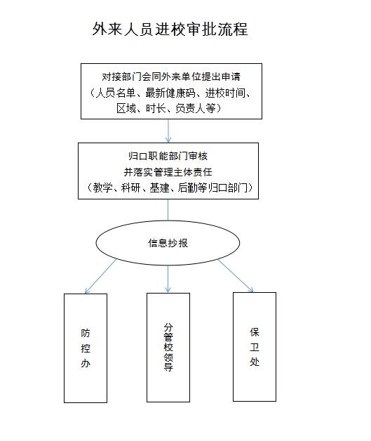 4.严禁外来人员未经审批进校。合作单位人员确因工作需要进校的,由归口部门按防控办明确的流程进行审核(见附件),并落实管理主体责任。