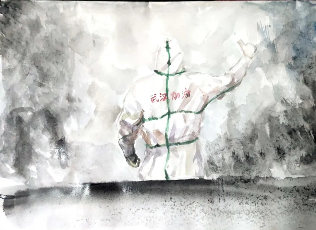 这幅水彩画的中心是一个医生穿着防护服的背影,灰黑色的背景色彩代表了这次疫情的潜在危险,而我们的医护人员不顾危险勇敢直面疫情,把自己后背留给了我们。——环境设计171 何巧红