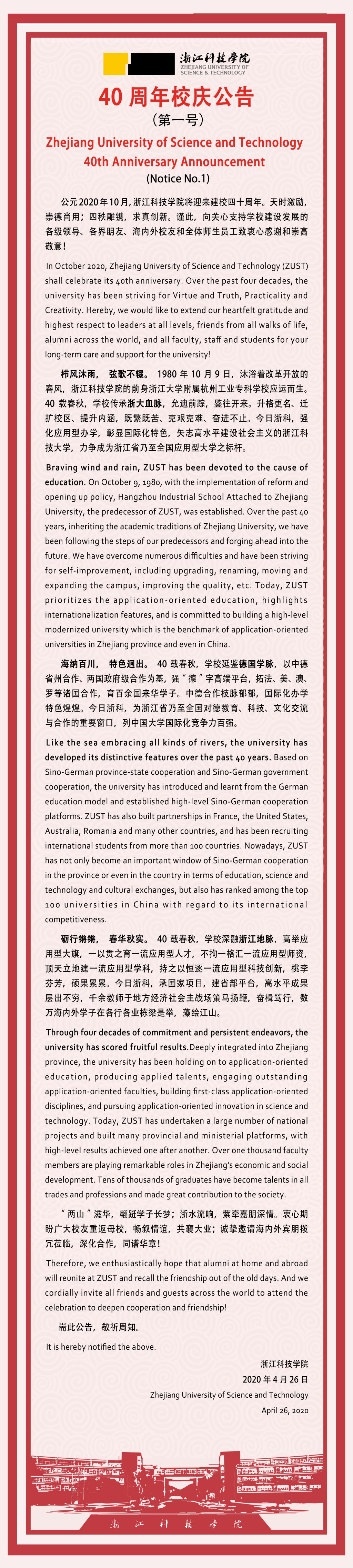 In October 2020, Zhejiang University of Science and Technology (ZUST) shall celebrate its 40th anniversary. Over the past four decades, the university has been striving for Virtue and Truth, Practicality and Creativity. Hereby, we would like to extend our heartfelt gratitude and highest respect to leaders at all levels, friends from all walks of life, alumni across the world, and all faculty, staff and students for your long-term care and support for the university!