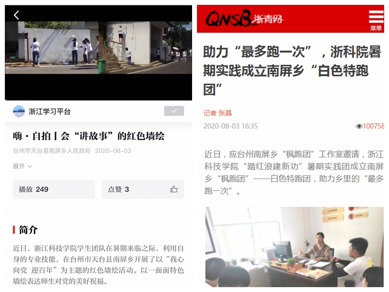 生化学院“踏红浪建新功”南屏暑期社会实践团队在台州市天台县南屏乡开展了以“我心向党 迎百年”为主题的红色墙绘活动。以一面面特色墙绘表达师生对党的美好祝福。学习强国以《嗨·自拍丨会“讲故事”的红色墙绘》为题、小时新闻以《红色暑期实践 | 我心向党迎百年,同心逐梦绘旗帜》为题(点击查看原文)为题,展示了实践团成员作画过程。实践团将红色文化教育贯穿其中,还开展“访红色基地、听党员故事、立窗口之志”主题教育活动,跟随当地老党员走访粟裕将军公园、粟裕将军纪念馆、杜岙村名人堂、杜岙村文化礼堂等红色基地,小时新闻(点击查看原文)对寻访活动进行了报道。在当地,“踏红浪建新功”暑期实践团成立南屏乡“枫跑团”——白色特跑团,助力乡里的“最多跑一次”,团员在乡政府办事大厅帮助村民使用自助服务终端,并在当地开展走访活动,在村民中普及“浙里办”与“钉钉”APP的使用方法,活动也受到了浙江新闻客户端、浙青网(点击查看原文)的关注。
