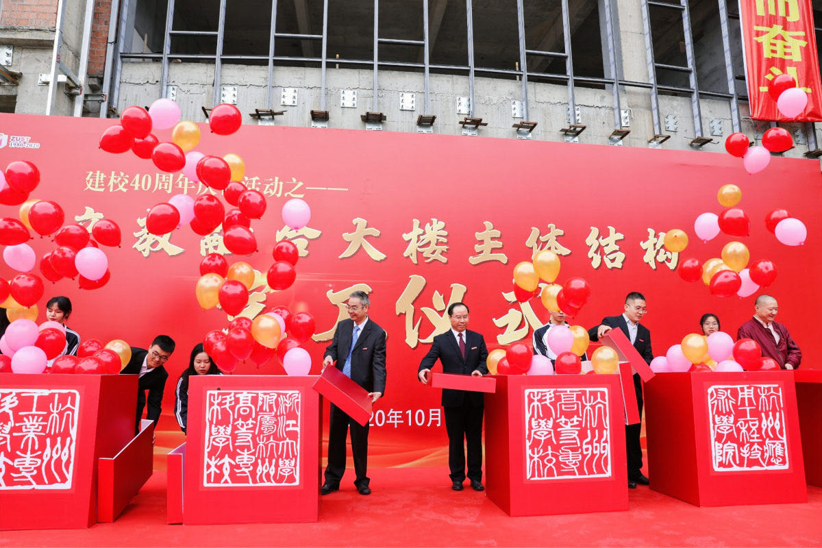 10月18日校庆活动日上午,产教融合大楼主体结构完工仪式在小和山校区举行。校党委书记龚建立宣布完工。龚建立、赵东福和师生代表共同放飞气球庆祝。