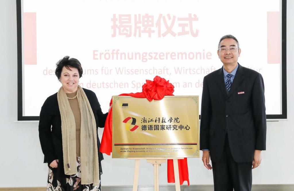 龚建立与欧珍共同为“浙江科技学院德语国家研究中心”揭牌。