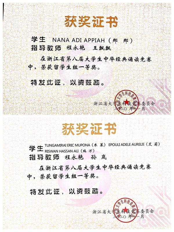 我校留学生NANA ADI APPIAH(那那)朗诵的《相信未来》、TUNGAMIRAI ERIC MUPONA(米莱)、EPOULI ADELE AURELIE(艾莉)、RISWAN HASSAN ALI(瑞万)朗诵的《我的南方和北方》获留学生组一等奖;汉语言文学专业19级李雅静、国际经济与贸易专业18级郑月、环境设计专业19级曹丽娜、视觉传达设计专业18级冯语诗等四位同学的作品获个人组二等奖;国际经济与贸易专业19级孙羽婷、汉语言文学专业18级励盼儿获个人组获三等奖;于敬潇、朱凌一、罗浩、邱卓能、叶梁萍、王天骋、许立坤等同学的《月光下的中国》,袁伟栋、章宁洁、刘雨欣、梁淑敏、陶喆勇、王磊等同学的《乌骓别霸王》获集体组三等奖。