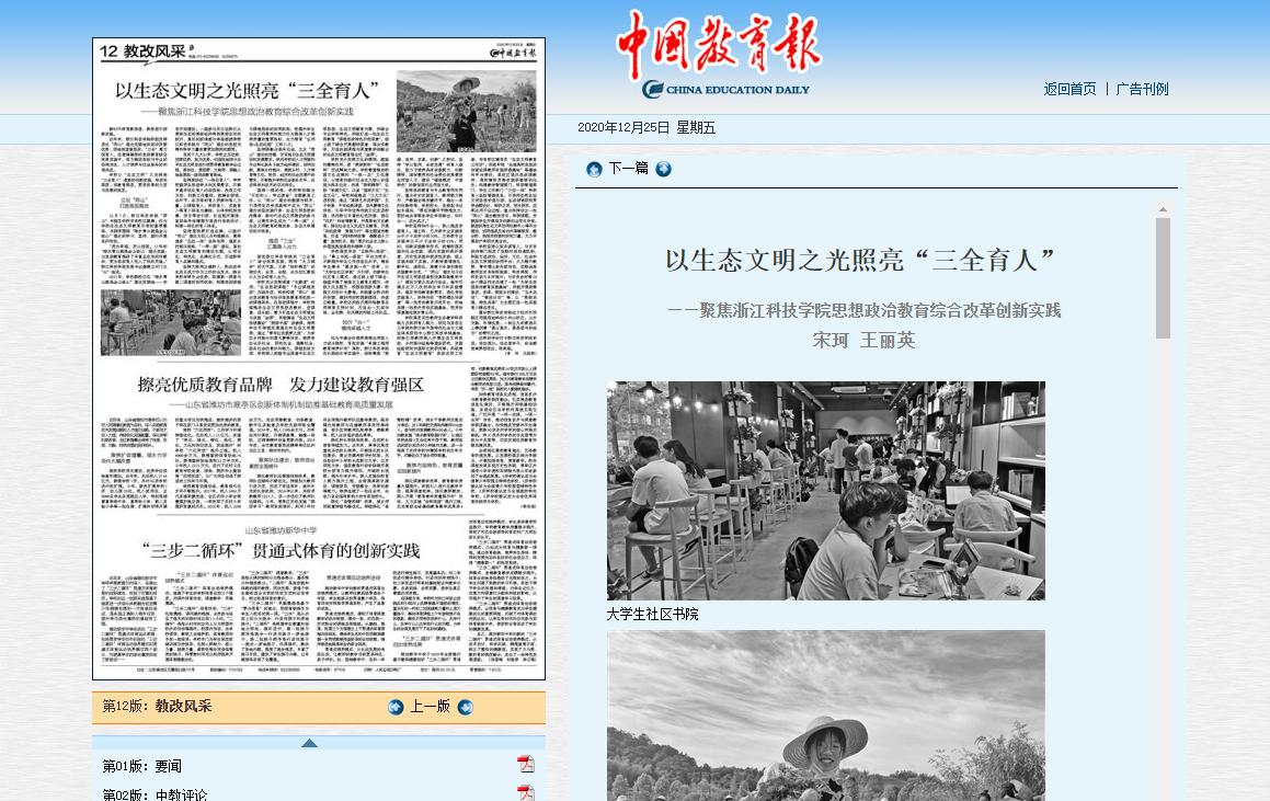 12月25日出版的中国教育报,刊发题为《以生态文明之光照亮“三全育人”》的文章,对我校思政教育综合改革实践中创新实践成果作了报道。报道全文如下: