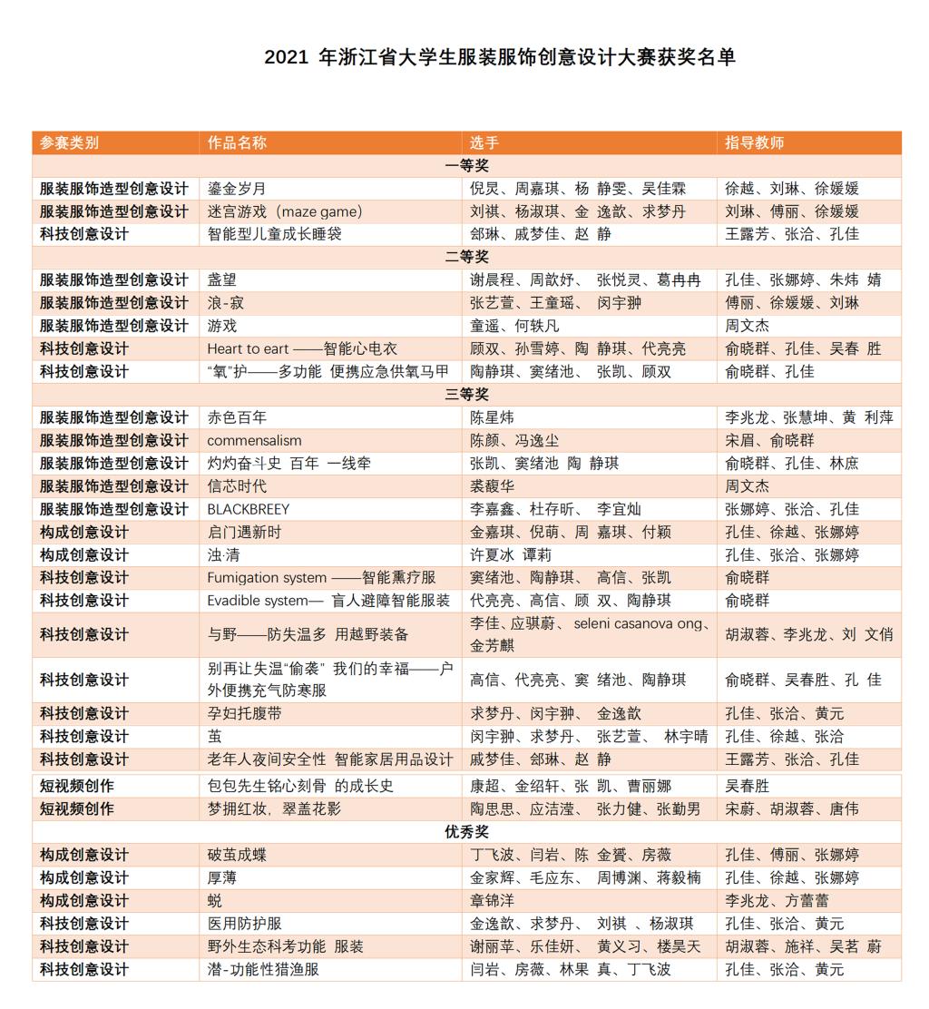 浙江省服装服饰创意设计大赛由浙江省教育厅、浙江省大学生科技竞赛委员会、浙江省纺织工程学会、浙江省服装行业协会共同主办,是省内唯一的服装设计类A类竞赛。大赛分为创意造型设计、构成创意设计、科技创意设计、时尚短视频等赛道,2021年大赛以“蜕变”为主题,通过作品展示、现场立裁、答辩等环节,充分展现了年轻艺术学子们的丰富创意。(艺术学院 张洽)