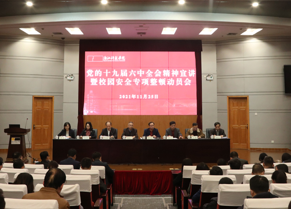 11月25日,学校召开党的十九届六中全会精神宣讲暨校园安全专项整顿动员会议。校党委书记龚建立、校长赵东福等党政班子成员出席会议。会议由校党委副书记周加敏主持。