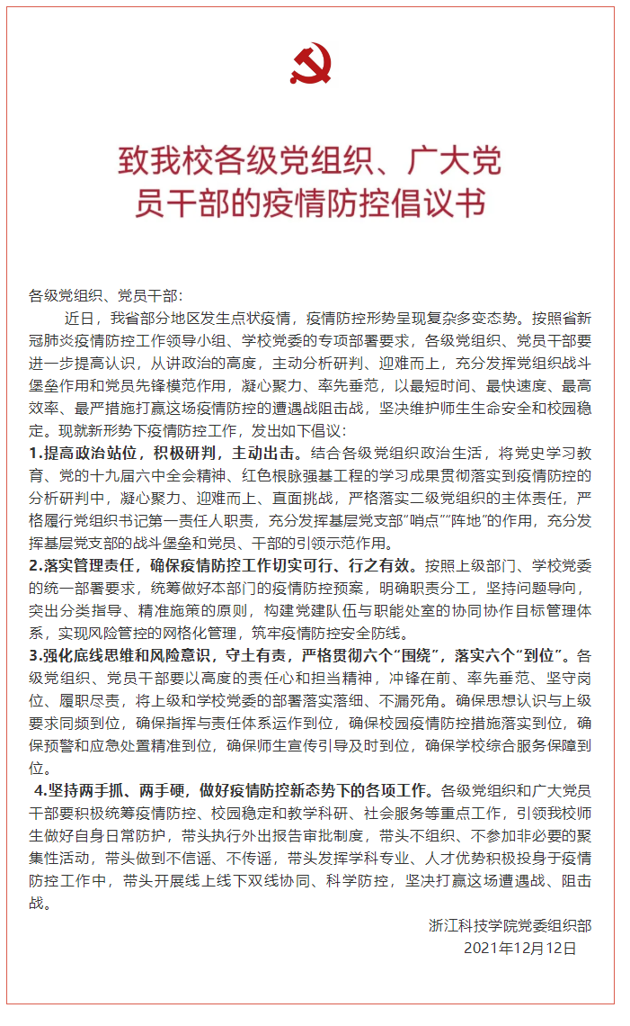 连日来,我省多地发生点状疫情,省委连续对全省疫情防控工作提出要求。为保护师生健康和守护校园安全,日前,校党委组织部向全校各级党组织和广大党员发出倡议。倡议书要求,全校各级党组织和广大党员深入贯彻习近平总书记关于新冠肺炎疫情防控工作的重要讲话和指示批示精神,按照省新冠肺炎疫情防控工作领导小组、学校党委新冠肺炎疫情防控专项部署要求,进一步提高认识,从讲政治的高度,主动分析研判、迎难而上,充分发挥党组织战斗堡垒作用和党员先锋模范作用,凝心聚力、率先垂范,以最短时间、最快速度、最高效率、最严措施打赢这场疫情防控的遭遇战阻击战,坚决维护师生生命安全和校园稳定。倡议书全文如下: