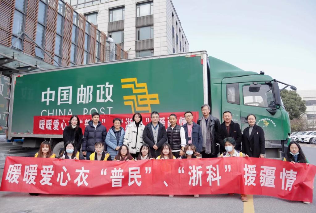 启运仪式后,杭州普民服饰有限公司董事长邓普民、艺术设计与服装学院师生、学校学生志愿者们,齐心协力共同将这批爱心冬衣装载上开往新疆阿克苏的中国邮政货车,预计二十天后,这批凝聚“普民”和“浙科”浓浓援疆情的冬衣将被送到有需要的学生和村民手中。