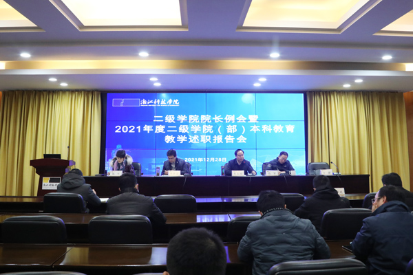 12月28日,学校召开二级学院院长例会暨2021年度二级学院(部)教育教学述职报告会,校长赵东福,副校长冯军、万健、陈平出席。会议由副校长单胜道主持。相关职能部门主要负责人和各二级学院(部)行政主要负责人及分管教学负责人参加会议。