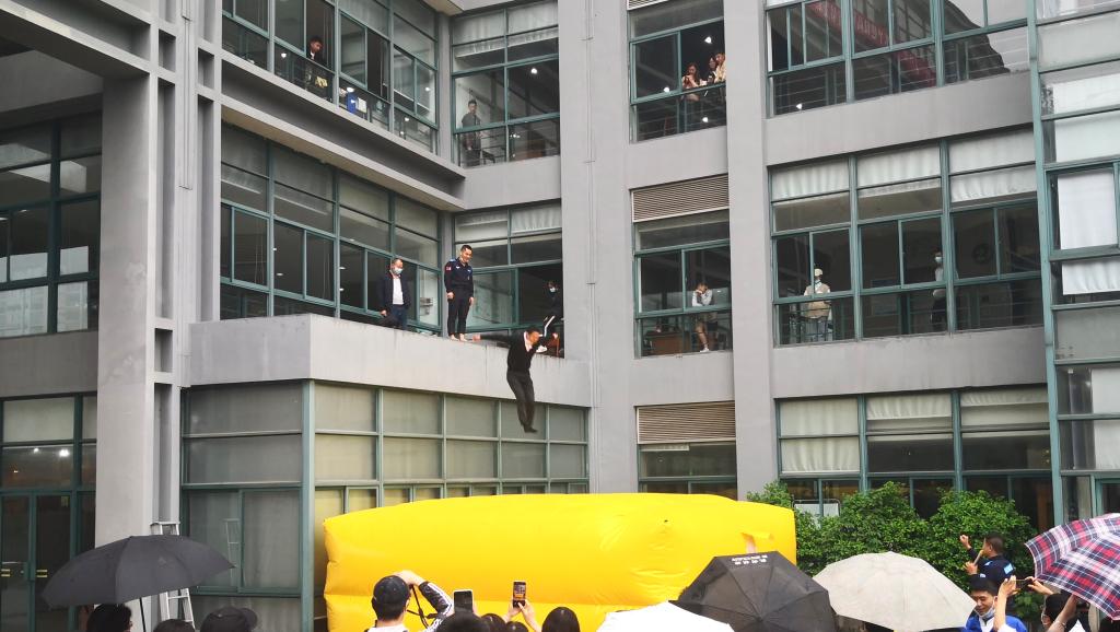现场师生代表先后进行了消防水带演练、灭火扑救演练和逃生气垫演练。