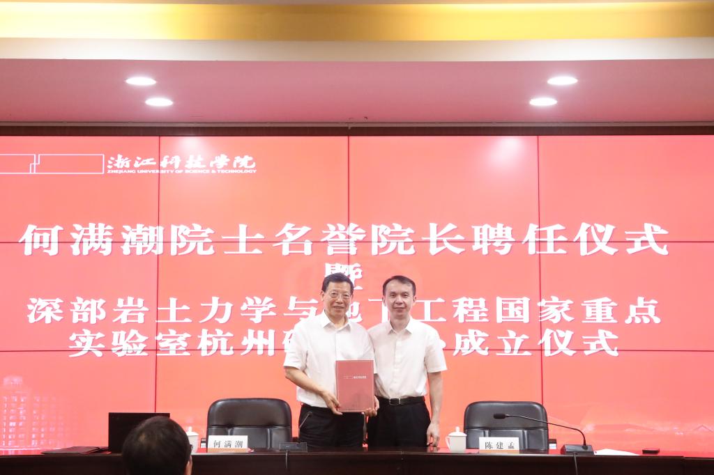 6月30日,学校举行聘任仪式,校长陈建孟教授为中国科学院院士、中国矿业大学(北京)深部国家重点实验室主任何满潮颁发聘书,聘请何满潮为我校土木与建筑工程学院名誉院长。仪式上,陈建孟和何满潮院士共同为深部岩土力学与地下工程国家重点实验室杭州研究中心揭牌。