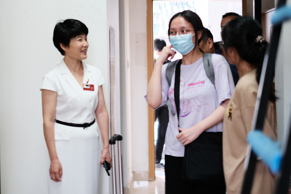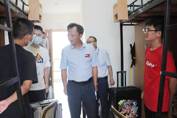 副校长陈平(左一)看望新生