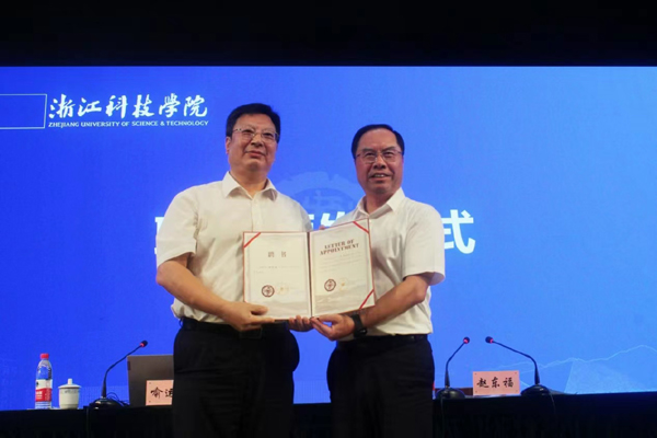 专题报告会前,举行了浙江科技学院客座教授受聘仪式,赵东福为喻运鑫颁发聘书。    (安吉校区综合办  张聪  学生记者  余雯慧)