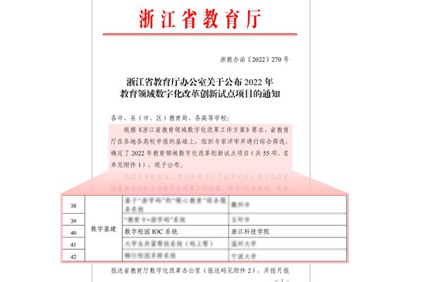 近日,浙江省教育厅公布2022年教育领域数字化改革创新试点项目名单,我校申报的“数字校园IOC系统”项目入选试点项目名单。