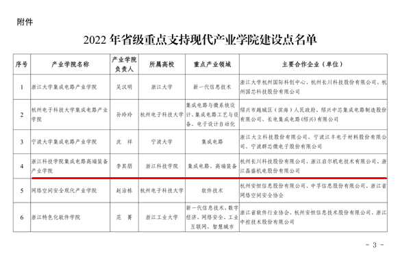 近日,浙江省教育厅、浙江省经济和信息化厅联合发布《2022年省级重点支持现代产业学院建设点名单的通知》,我校集成电路高端装备产业学院成功入选。
