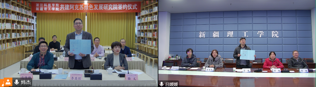 11月10日,我校与新疆理工学院共建阿克苏绿色发展研究院线上签约仪式举行,副校长李其朋、新疆理工学院副校长王宏出席,并分别代表双方签署协议。