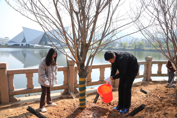 春光明媚,绿染大地,西蜜湖畔一片生机盎然。在植树点大家扶树正苗、挥锹培土、填坑浇水……分工协作、干劲十足,经过辛勤劳动,新种下的18棵樱花树迎风挺立,散发勃勃生机。参加植树活动的同学们说,今年是杭州亚运年,“绿色”是杭州亚运会的重要办赛理念,希望自己能为亚运碳中和贡献应有的一份力量,以实际行动践行“绿水青山就是金山银山”发展理念。