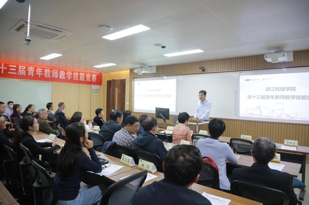 5月12日,校第十三届青年教师教学技能竞赛举行,来自15个学院的27位青年教师同台竞技,展示课堂教学风采。副校长单胜道现场指导。