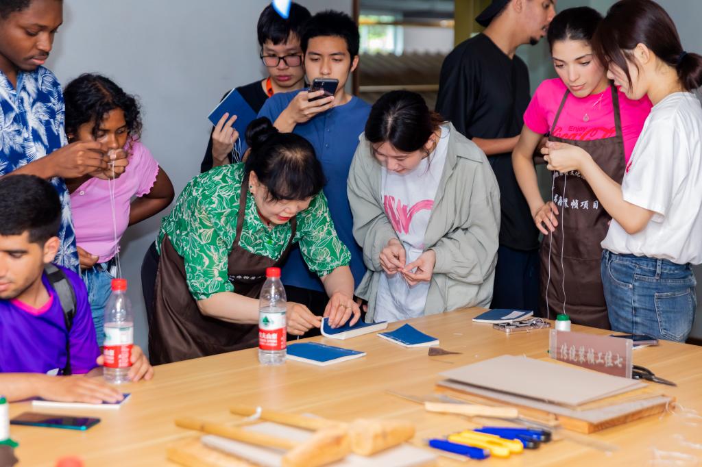 线装是中国古籍装帧技术的集大成者,在杭州富阳非物质文化遗产传承学校,留学生们聆听了由传统线装书市级非遗传承人章玉兴老师所做的讲座。他详细从竹简、木简到纸张,从线装到钉装,从卷轴到册页,一一为留学生们讲解了古代书籍的发展历程。同时也介绍了线装的基本方法和技巧,现场指导学生使用传统工具和材料,体验线装书籍的整个过程。从扣书衣,到做书钉,再到打孔、穿线装订……看似简单的过程,每个步骤都考验着同学们的耐心和细心。经过一道道工序,一本本传统线装书在现场“诞生”。通过亲身体验传统装帧技艺,留学生们更加深入地了解了古代书籍的发展历史和修复技巧,对精美的线装书连连赞叹,并且更加深刻地感受到古籍修复的艰辛和工艺的精湛。