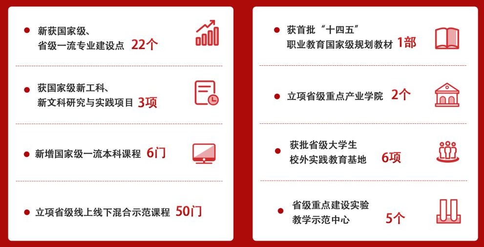 学校积极回应时代命题,持续深化教育教学改革,获国家级、省级教学成果奖4项,全国优秀教材奖1项。聚焦“新工科、新医科、新农科、新文科”,深化本科专业结构调整和课程建设,推动人才培养模式改革,不断增强与经济社会发展的契合度。新获国家级、省级一流专业建设点22个,获国家级新工科、新文科研究与实践项目3项部。新增国家级一流本科课程6门,立项省级线上线下混合示范课程50门。获首批“十四五”职业教育国家级规划教材1部,立项省级重点产业学院2个。获批省级大学生校外实践教育基地6项,省级重点建设实验教学示范中心5个,为区域经济社会发展培养了大批高素质应用型人才。学校入选“十四五”时期国家教育强国推进工程储备院校。优化教学质量内控管理,加速推进外部评估认证,教育教学质量保障系统日趋完善。