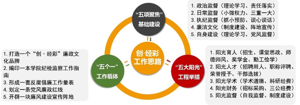 落实全面从严治党政治责任,一体推进基层党建、党风廉政、思想政治、意识形态、“三全育人”、人才队伍、师德师风、安全稳定等工作,2023年学院廉洁教育基地通过学校验收并授牌。强化“勤廉并重”,深入推进“五项聚焦”基础建设,创新落实“五个一”工作载体,精准实施“五大阳光”工程举措,构建学院矩阵化的纪检监察工作治理体系,打造“创·经彩”廉洁文化品牌,为开创学校学院事业发展新局面提供坚强的政治保障。