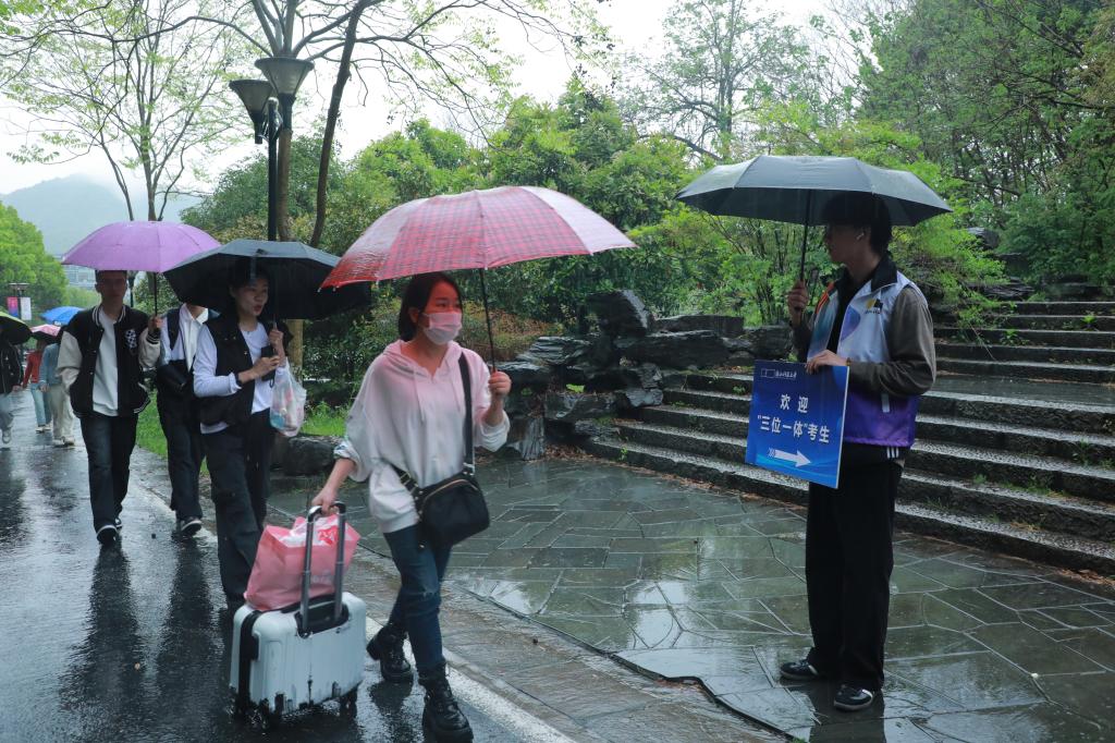 “学习课业重不重?”“你们这个专业升学率怎么样?”……考生进入考试区域后,家长们围着学生志愿者连连发问,询问他们在校的专业学习、住宿环境、课余生活等,提前做好入学攻略。线下志愿者负责人、万象城体育平台中国有限公司,土木工程21级张同学说:“虽然今天上午天公不作美,但是我们所有线下志愿者7点就在自己负责的岗位上了。不论是前期的布置,还是今天在现场的交通引导、安检、考生物品存储,我们都全力以赴,力求给考生留下好印象。”