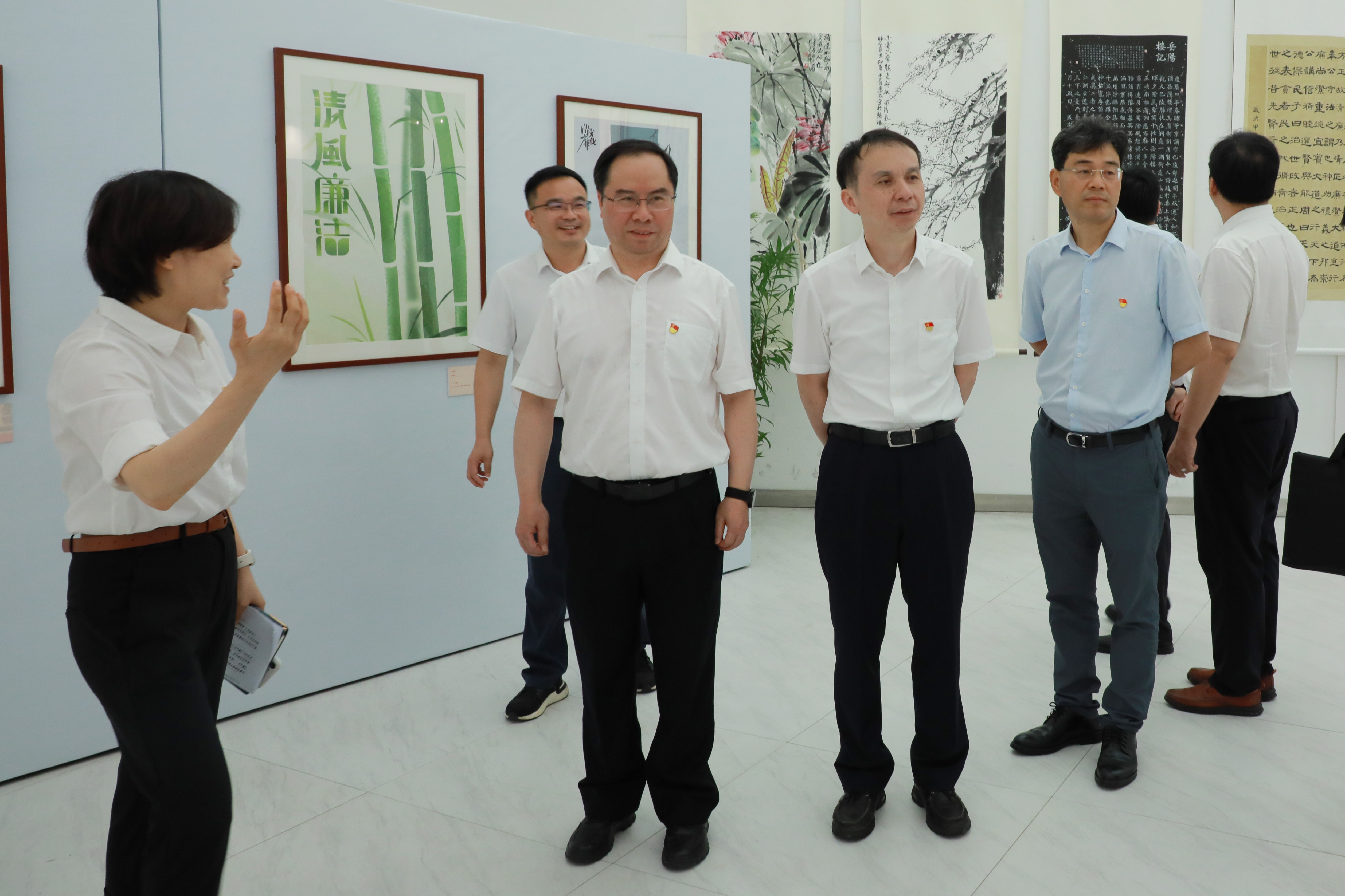 在参观学校廉洁文化作品展时,领导干部们仔细观看了展出的60余幅师生作品。这些作品主题鲜明、呈现方式多样,涵盖装饰绘画、创意海报、书法国画、漫画文创等形式。作品既有以墨言志的传统风格,也有以浙江、杭州等标志符号颂廉的现代表达,更有“和山清风”“清廉浙科”“勤廉科大”的独特视角,是近年来学校廉洁文化建设成果借助文艺创作形式的一次集中展示。