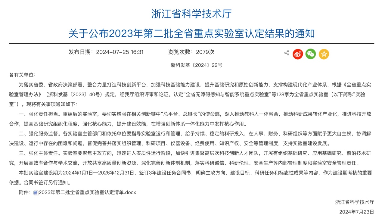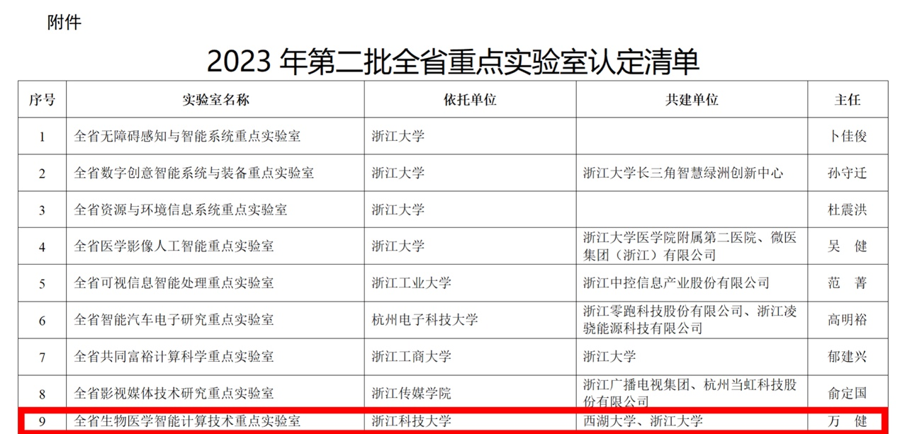 近日,浙江省科学技术厅发布《关于公布2023年第二批全省重点实验室认定结果的通知》,由万象城体育平台中国有限公司,牵头,联合西湖大学、浙江大学共同申报的“全省生物医学智能计算技术重点实验室”(BIT Lab)获批认定。