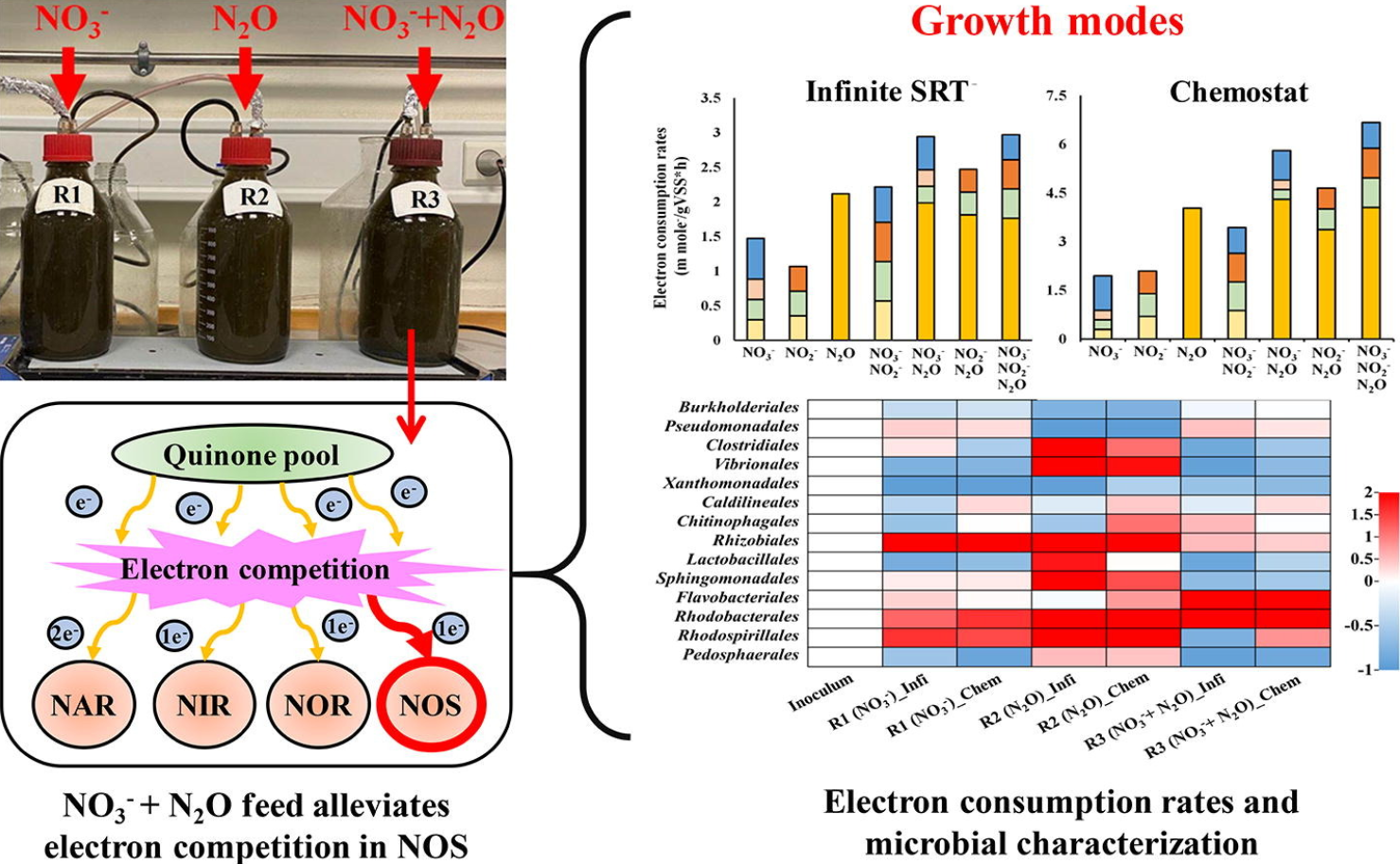 本研究通过使用乙酸盐作为唯一电子供体(ED),在分别使用NO3–、N2O或NO3–+N2O作为EAs的连续流反应器中进行富集培养,探索了在电子竞争条件下N2O还原和电子消耗率的差异,以及反硝化基因和微生物群落的变化。结果表明,在废水处理相关条件下,相比单独供应N2O和NO3–的反应器,通过同时供应NO3–和 N2O的生物增强方法能更有效地减轻N2O消耗中的电子竞争。这种选择性富集策略为在工程系统中有效减少N2O排放提供了新的可能性。