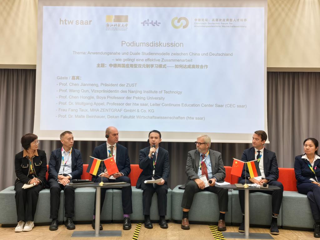 分论坛报告结束后,陈建孟、南京工程学院副校长汪群、北京大学博雅教授陈洪捷、萨尔技术经济大学教授沃尔夫冈·阿珀尔、MHA ZENTGRAF有限责任公司亚太区经理方·陶克斯与萨尔技术经济大学经济学院院长马尔特·贝恩豪尔共同展开圆桌对话,就中德两国如何在应用型双元制学习模式中达成高效合作进行深入探讨。圆桌对话由我校中德合作委员会主任约阿希姆·利兹教授主持。