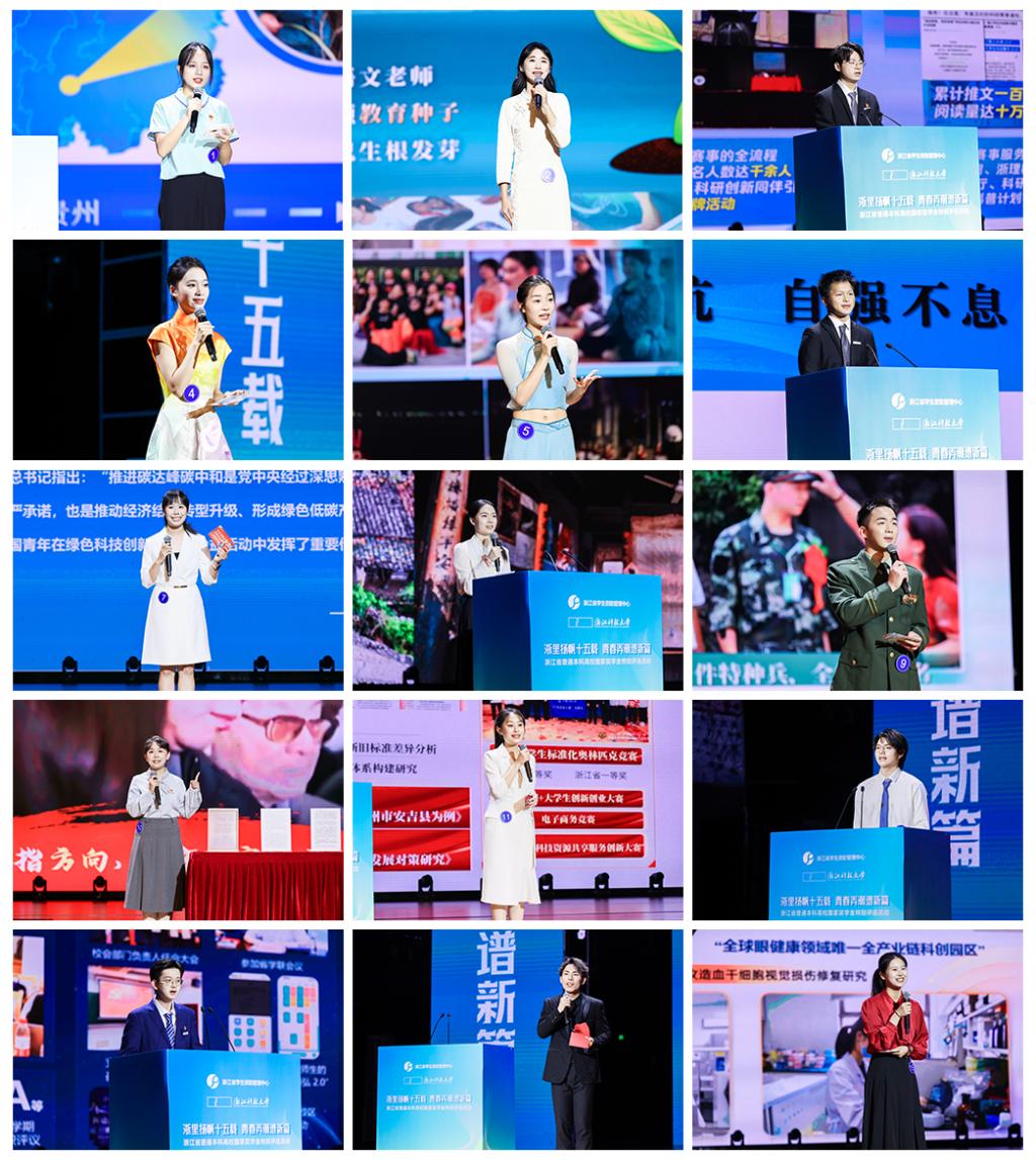 青春奋斗,榜样先行。活动现场,选手们按照抽签顺序依次登台,以推荐视频、个人展示和即席讲演的形式进行自我风采展示,动情讲述了自己的青春追梦故事。他们中,有人深耕学术研究,孜孜不倦探索未知领域,发表多篇具有高水平影响力的论文;有人在学科竞赛中挑战自我,在竞赛舞台上大放异彩,展现卓越实力和非凡才华;有人是“00后宣讲员”,用声音传递奋斗力量,在校内校外讲好中国故事、浙江故事;有人坚韧不屈,自强不息追逐梦想,以奋斗书写青春故事。