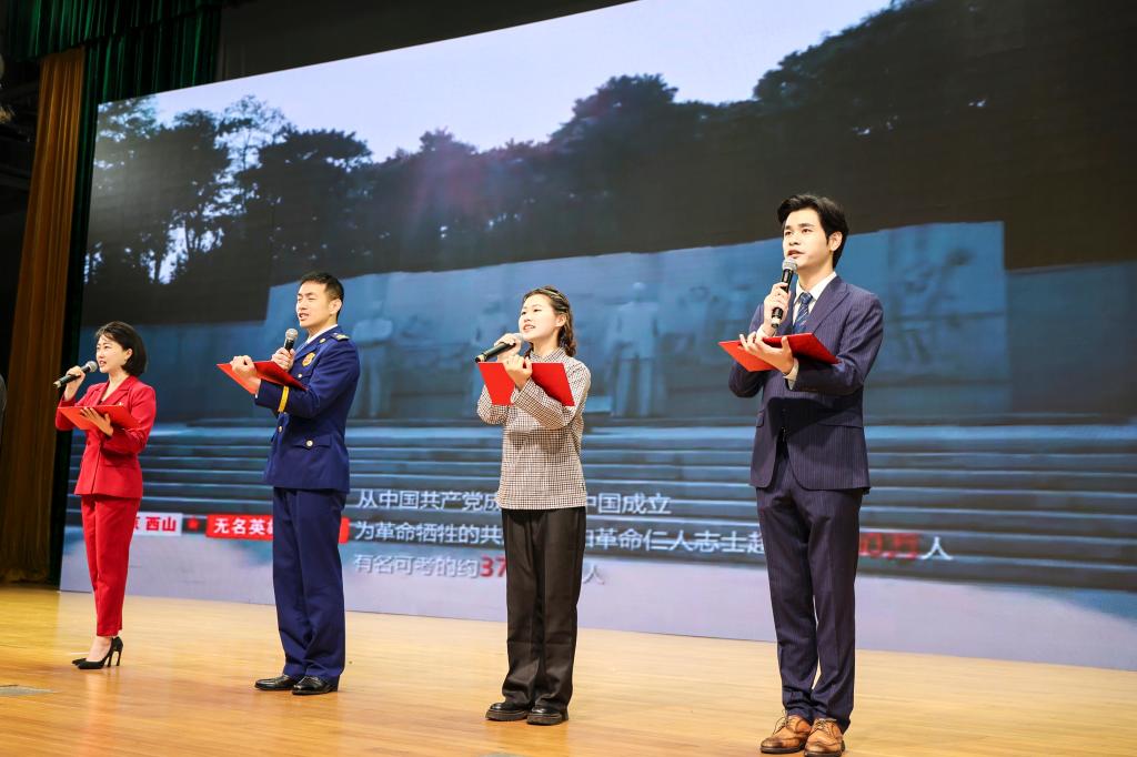 在60分钟的思政课堂上,来自我校的30余名学生和全省各地烈士纪念设施保护单位的8名英烈讲解员依次走上舞台,采用舞台剧、主题讲述、情景朗诵等沉浸式宣讲形式,为现场800余名师生呈现英烈们“为中国人民谋幸福、为中华民族谋复兴”的感人故事。其中,情景舞蹈《晨光》深情回望无数英雄烈士风华正茂时,为了信仰奔赴远方,以血肉之躯铸就民族的脊梁;主题讲述《不倒的红旗》重现我陆海空三军将士挥师一江山,在枪林弹雨、惊涛骇浪中前仆后继、浴血奋战的历史画面;《泛白的旗帜,深情的守候》讲述一面旗帜,见证宁绍台地区风起云涌的革命史,更见证一位妻子对丈夫几十年的痴心守候;舞台剧《浙西南刘胡兰——潘香凤》再现中共地下女交通员潘香凤在狱中面对敌人的残酷拷问,宁死不屈的感人故事;《英雄的81192》展现“海空卫士”王伟在美军侦察机入侵南海之际,为坚决捍卫祖国领空主权,不惧对手、英勇亮剑的英雄事迹;情景故事《回家》讲述抗美援朝烈士用生命写就一部英雄史的伟大壮举;情景讲述《为了谁》展现一线消防员勇敢逆行、赴汤蹈火,时刻保卫着祖国和人民生命财产安全的感人瞬间……活动最后,全体宣讲员们集体演绎诗歌朗诵《信仰的力量》,极富感染力和感召力,现场掌声经久不息。