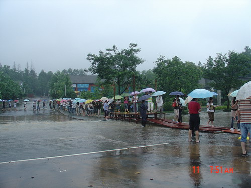6月11日凌晨,后勤公司员工在积水严重的留和路学校大门前搭起了一座临时桥,以方便东和公寓学生早上出行。
