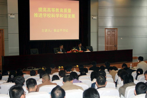 3月28日下午,十七大精神集中培训举行第四讲专题辅导,校党委书记徐志平作题为“提高高等教育质量,推进学校科学和谐发展”的报告。校党委副书记陈浩主持报告会。